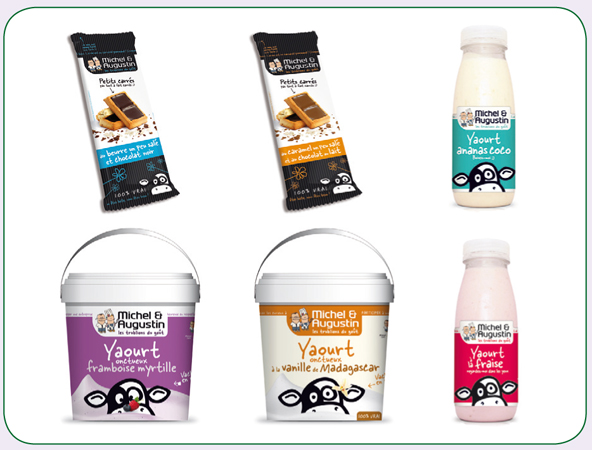 La marque « Michel & Augustin » représente une caricature des deux fondateurs, le logo est symbolisé par une vache. Les emballages sont respectueux de l’environnement (papier recyclable, conditionnement minimum), et ils sont recouverts de charades et de blagues.