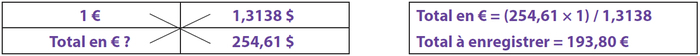Exemple : réception le 15/01 d’une facture de 254,61 $ en provenance des États-Unis à régler le 28/02. Le taux de change à la date de facturation est de 1 € = 1,3138 $ (ou USD : United States Dollar).