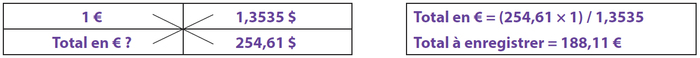 Exemple (suite) : paiement le 28/02 de la facture de 254,61 $ en provenance des États-Unis. Le taux de change à la date de paiement est de 1 € = 1,3535 $.