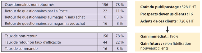 Exemple : après l’envoi de 200 questionnaires (avec un coupon de promotion de 10 %) à l’ensemble des habitants varois ayant déposé un permis de construire pour une piscine l’an passé, un magasin de fournitures de produits d’entretien et d’accessoires de piscine a établi les statistiques suivantes.