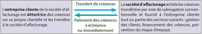 L’affacturage (ou « factoring ») consiste en un transfert de créances commerciales (factures) de leur titulaire à une société d’affacturage ou un facteur (ou « factor »). Ce dernier se chargera de garantir le recouvrement (paiement) des créances, même en cas de défaillance momentanée ou permanente du débiteur. |