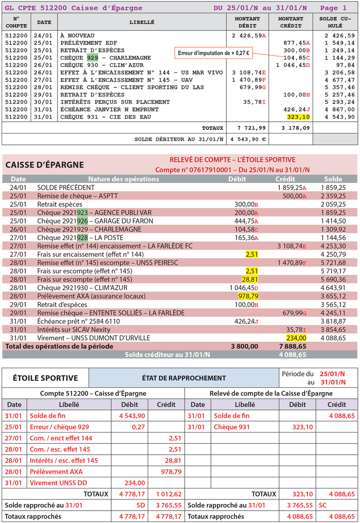 • Étape 1 : lettrer les soldes de départ. (S’ils sont différents, une astuce existe : il faut repérer le numéro du premier chèque dans le compte « Banque » et, sur le relevé bancaire, tous les numéros de chèques antérieurs à celui-ci équilibrent généralement les soldes de départ.) ➔ voir lettrage A, exemples 2.3.1 et 2.3.2.