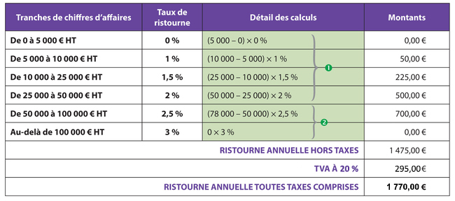 La ristourne pourra représenter un pourcentage fixe du chiffre d’affaires ou une série de pourcentages appliqués en fonction de tranches. Comme elle se calcule a posteriori et se base sur plusieurs documents commerciaux, elle ne pourra se retrouver en pied de document comme pour les autres réductions. Son calcul sera indépendant et fera l’objet d’un document commercial à part.
